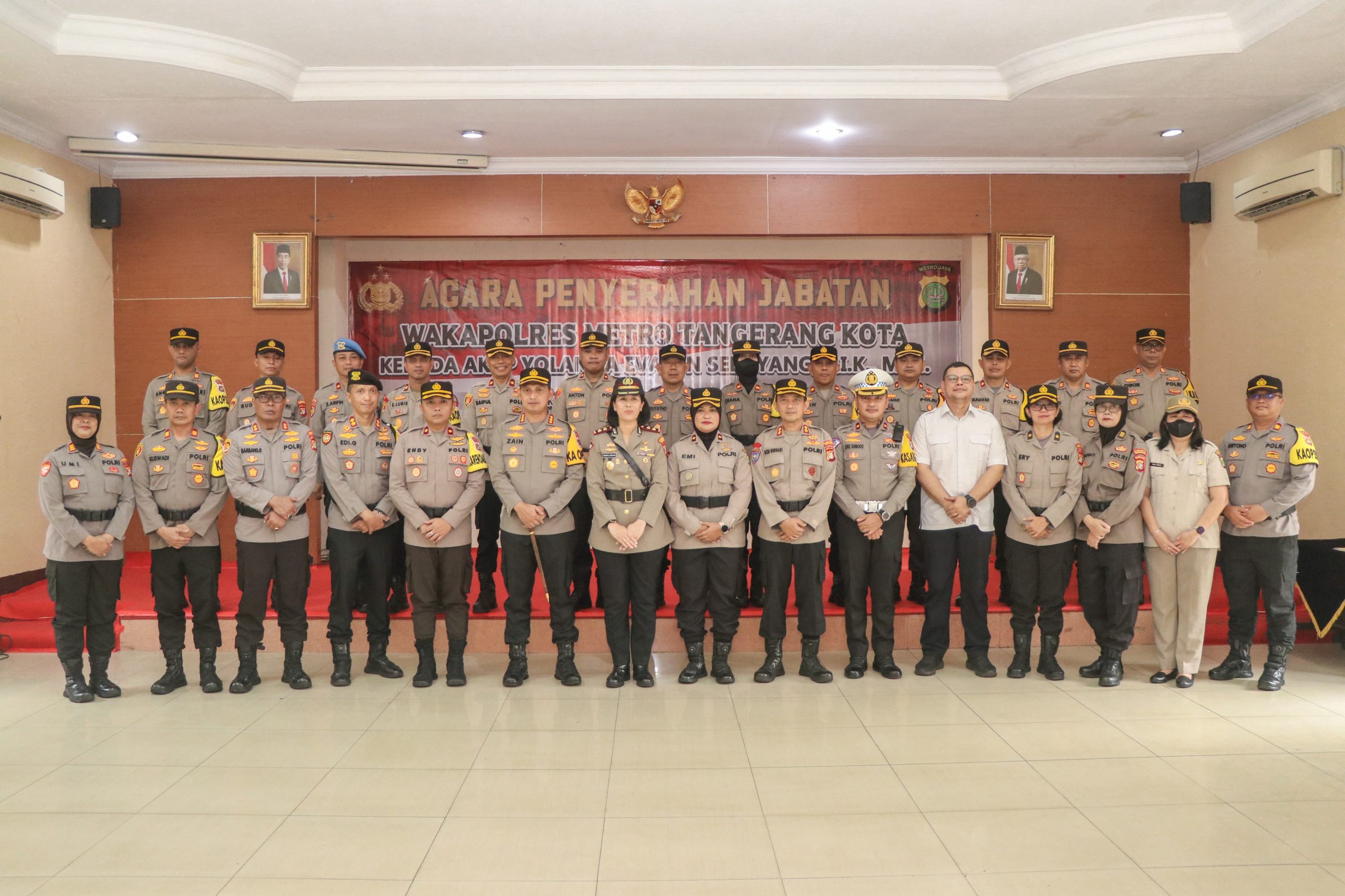 Kapolres Metro Tangerang Kota, Komisaris Besar Polisi Zain Dwi Nugroho, SH, S.Ik , M.Si memimpin upacara penyerahan jabatan Wakapolres, di Aula Gedung Polres Metro Tangerang Kota, Polda Metro Jaya Kamis, (28/12/2023) pagi.