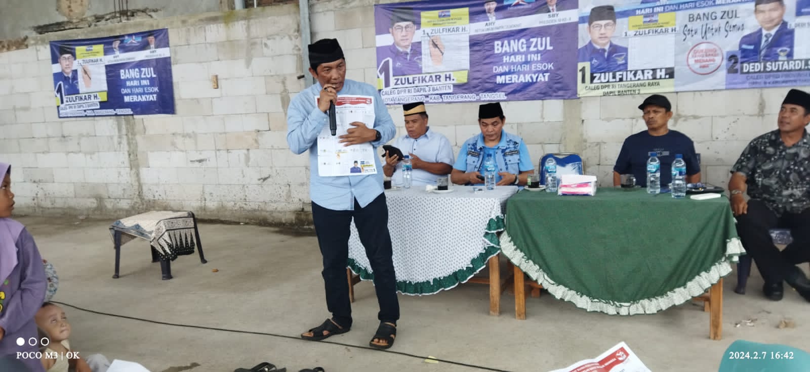 Globalbanten.com | Anggota DPR RI Dapil Banten 3 dari Partai Demokrat, Zulfikar H.,SH, melakukan kegiatan kunjungan daerah pilihan ( KUNDAPIL ) Banten 3 masa konferensi 3 tahun 2023 – 2024 dengan mengunjungi warga kecamatan Solear, diantaranya warga Ds.Munjul, Ds.Cikuya dan Ds.Cikasungka.