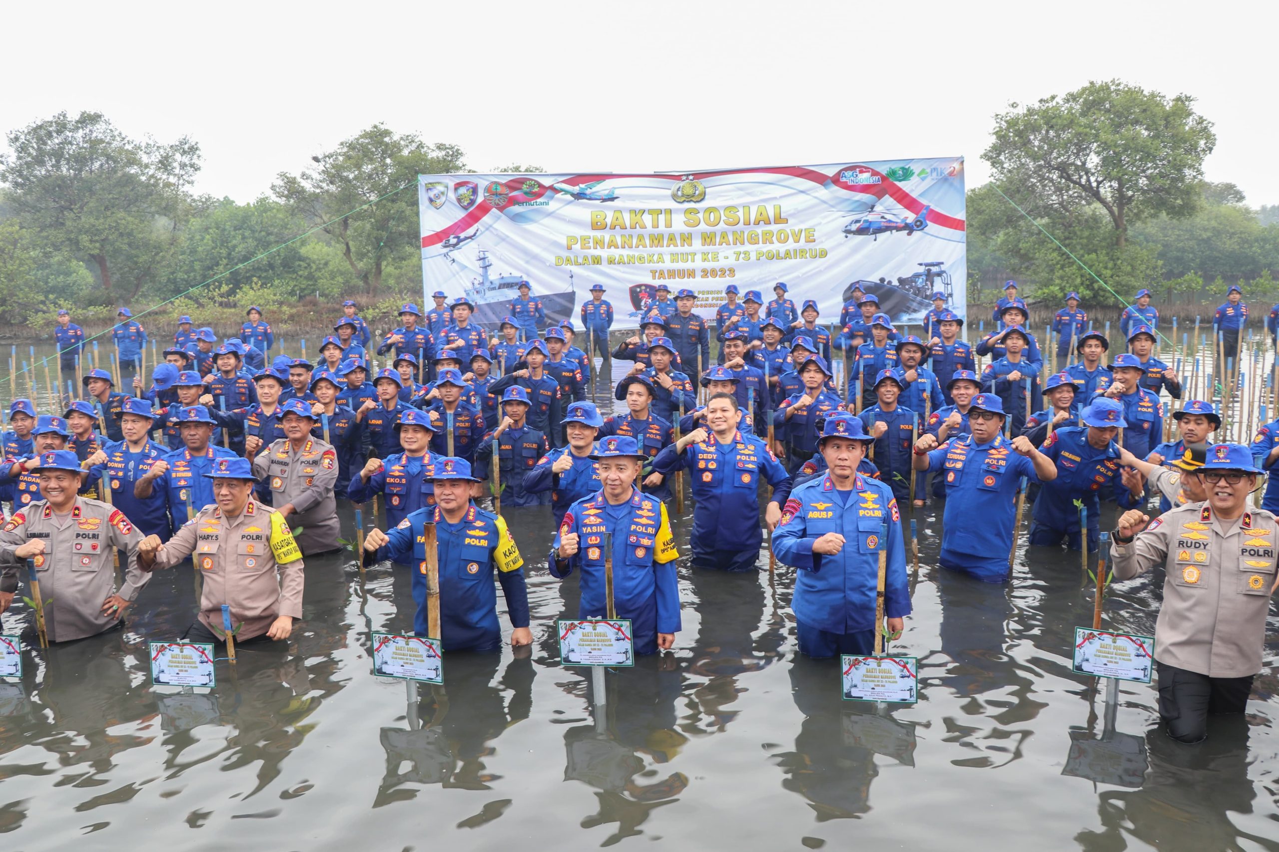Globalbanten.com l Tangerang Dalam rangka memperingati HUT ke-73 Polairud, Kepala Badan Pemeliharaan dan Keamanan (Kabarhakam) Polri Komjen Pol, M. Fadil Imran memimpin kegiatan bakti sosial (baksos) bersih-bersih dan menanam 2000 bibit mangrove di Pantai Tanjung Pasir, Kecamatan Teluknaga, Kabupaten Tangerang, Sabtu (25/11/2023) pagi WIB.