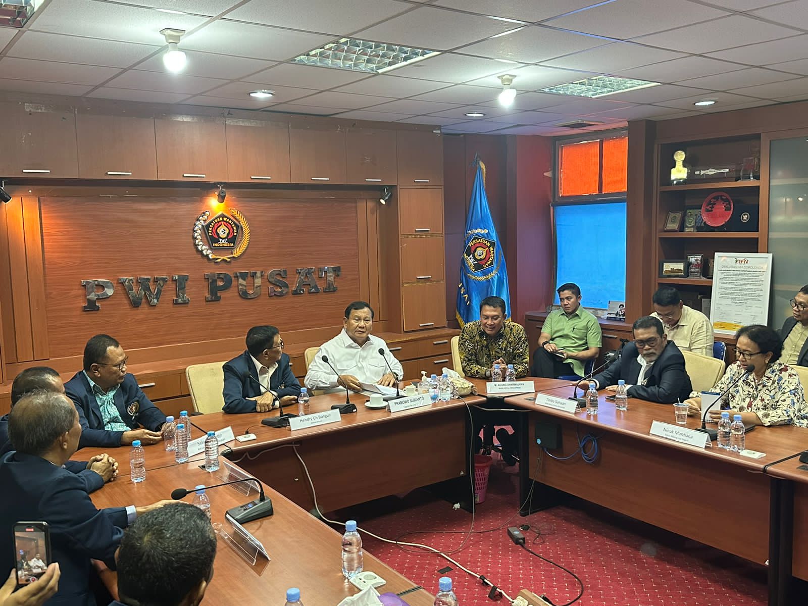 Prabowo Subianto yang datang mengenakan pakaian serba cream ini disambut Ketua Umum PWI Pusat, Hendry Ch Bangun, Sekjen PWI Pusat Sayid Iskandar, Wasekjen Raja Pane dan seluruh jajaran PWI Pusat. Dengan sumingrah Prabowo berjalan menuju ruang pertemuan di Lantai IV Ruang PWI Pusat.