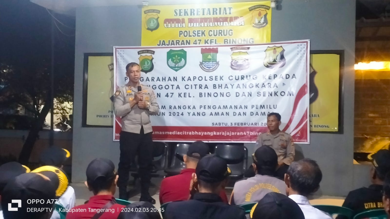 Globalbanten.com | Dalam Rangka Pengamanan Menyambut Pemilu Tahun 2024 yang aman dan damai Kapolsek Curug memberikan Pengarahan kepada anggota Citra Bhayangkara Jajaran 47 dan Senkom di Pos Terpadu Kelurahan Binong Kecamatan Curug. Sabtu, 3/2/2024.