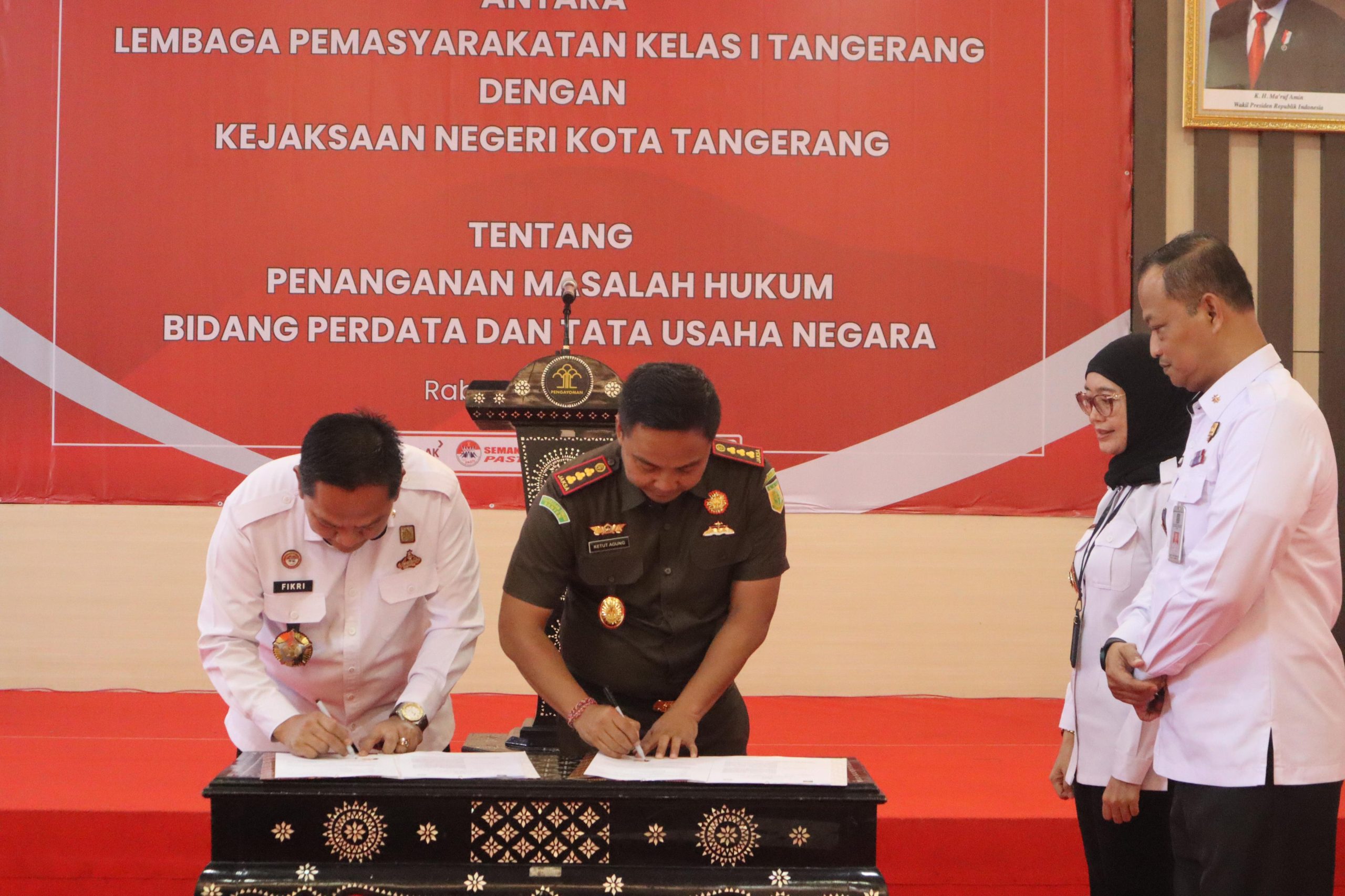 Penandatanganan MoU tersebut dilakukan langsung oleh Kepala Lapas Kelas I Tangerang Fikri Jaya Soebing dan Kajari Kota Tangerang I Ketut Maha Agung disaksikan, oleh Kepala Divisi Pemasyarakatan Kantor Wilayah Kemenkumham Banten Jalu Yuswo Panjang dan Kepala Divisi Administrasi Kantor Wilayah Kemenkumham Banten Nur Azizah Rahmanawati.