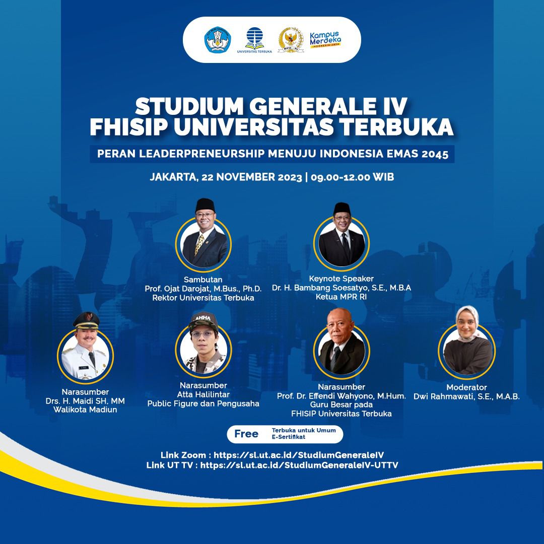 Globalbanten.com l Universitas Terbuka (UT) adalah Perguruan Tinggi Negeri (PTN) ke-45 di Indonesia yang menerapkan sistem belajar terbuka dan jarak jauh. Dalam hal ini Universitas Terbuka mengelar Studium Generale IV Fhisip dengan tema “Peran Leadership Menuju Indonesia Emas 2045” yang di pusat kan di Gedung Nusantara IV MPR Rl jakarta pada 22 November 2023.